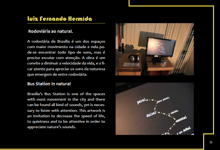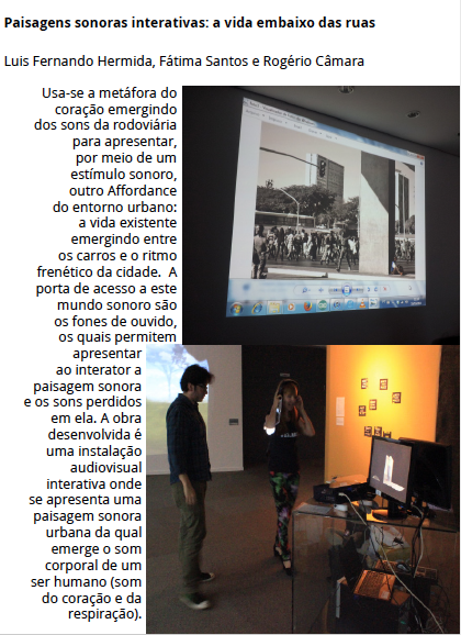 Paisagens sonoras interativas: redescobrindo a rodoviaria de Brasilia (2014-2016). My first approach to immersive processes from binaural recordings began with my Master of Arts degree at the University of Brasilia. In addition to theorizing about perceptual processes, the world of sound, and the city’s affordance, this project included the development of three interactive sound installations. They show binaural recordings and interactive systems that offered another vision of Brasilia’s bus station soundscapes. «O coração da Rodoviária» was presented at the National Museum of Brazil in Brasilia as part of #13.ART (2014). While «Rodoviária ao Natural» was exposed at the Banco do Brasil Cultural Center as part of the Understanding Visual Music (UVM 2015).